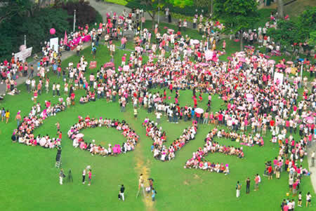 Participants, including local celebrities, traditional Chinese and Malay dance troupes, parents and children, pink-furred pets, and a couple sporting pink T-shirts that said "Straight but not Narrow" gathered to form a giant pink dot for an arial camera before releasing pink balloons and waving pink umbrellas.